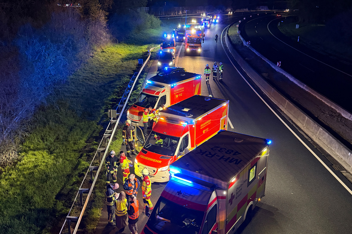 Die Unfallstelle erstreckte sich über eine Länge von 300 Metern. (Bildquelle: Feuerwehr Mülheim an der Ruhr)