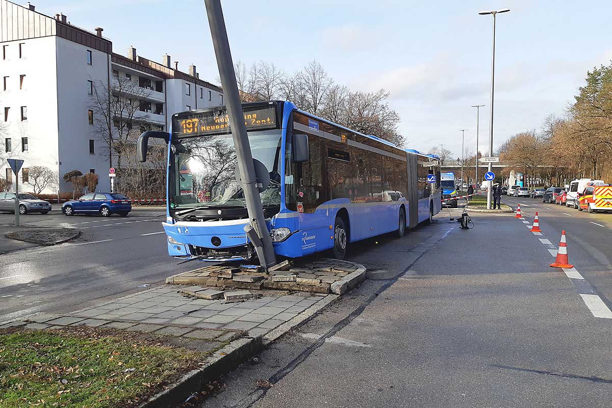 Der Fahrbahnbereich um den verunfallten Bus wurde abgesperrt. Die Besatzung eines Hilfeleistungslöschfahrzeuges kühlte die aufgeheizten Reifen und sicherten den beschädigten Laternenmast.