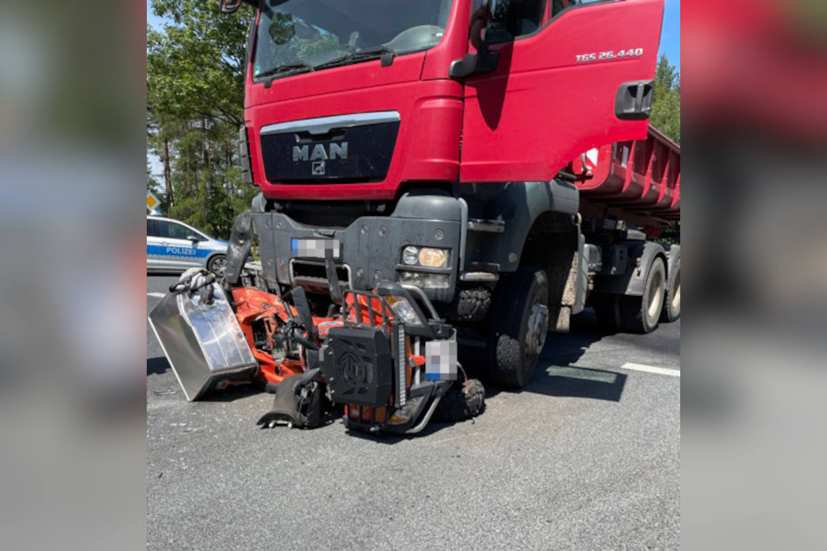 Ein 48-jähriger Fahrer eines Lkw stieß dort im Kreuzungsbereich "Schwarze Marie" mit einem von rechts, aus Richtung Munster kommenden, vorfahrtberechtigten Quad zusammen. Das Fahrzeug wurde bei dem Zusammenstoß unter der Fahrzeugfront des Lkw eingeklemmt. Der 49jährige Fahrer erlitt lebensgefährliche Verletzungen und wurde mit einem Rettungshubschrauber in ein Krankenhaus verlegt. Der Sachschaden wird auf 13.000 Euro geschätzt.