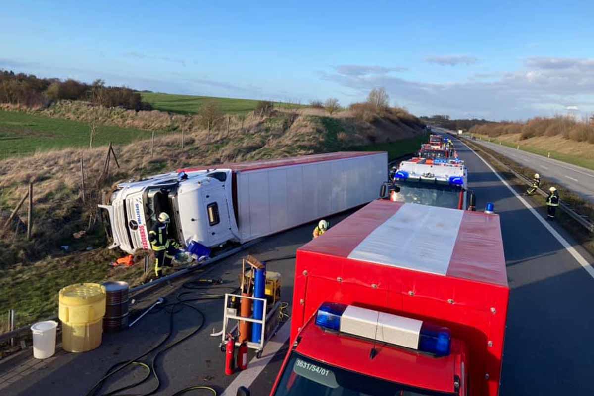 Aufgrund von Unaufmerksamkeit kam der Fahrzeugführer eines Sattelzuges nach rechts von der Fahrbahn ab und kippte in die Bankette (Bildquelle: Feuerwehr Neukloster)