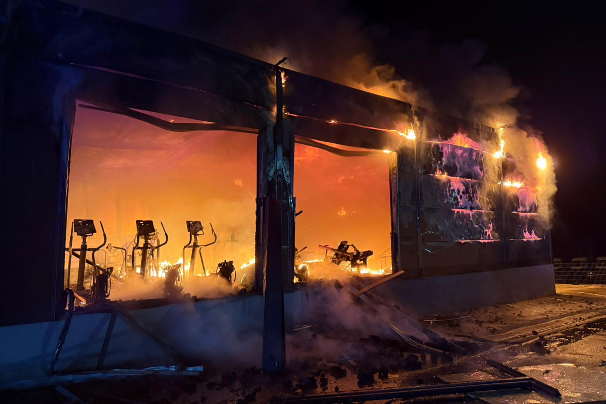 Brandbekämpfung unter Atemschutz im Gebäudeinneren musste die Feuerwehr wegen der massiven Brandausbreitung und -intensität einstellen. Diese führte schließlich auch zum weitgehenden Einsturz des Flachdaches über dem Fitnessstudio.