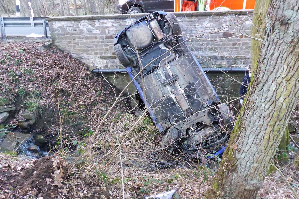 Gestützt wurde das Auto von der Brücke über dem Bach in Neunkirchen-Seelscheid (Bildquelle: Kreispolizeibehörde Rhein-Sieg-Kreis)