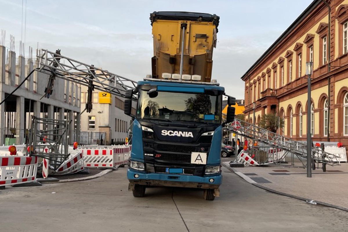 Beim Losfahren kollidierte die aufgerichtete Mulde in der Bahnhofsstraße mit einer quer über der Fahrbahn montierten Baustellenbrücke. Die Konstruktion stürzte um und kam auf dem Fahrzeug zum Liegen.