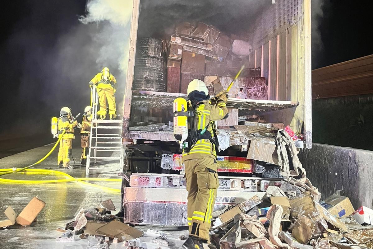 Auf der A3 bei Neustadt/Wied (RP) ist am Freitagabend, 13.03.2026, ein mit Paketen beladener Lkw-Anhänger in Brand geraten. Die Feuerwehr war mehrere Stunden im Einsatz, um das Feuer zu löschen. Verletzt wurde niemand.