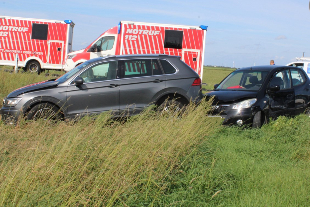 Gegen 13:15 Uhr befuhr ein 73-Jähriger aus Nörvenich mit seinem Pkw die L263 in Richtung Eschweiler über Feld. Vor ihm befand sich eine 29-jährige Frau, ebenfalls aus Nörvenich, mit ihrem Pkw. Der 73-Jährige setzte zum Überholen an, als im selben Moment das vor ihm fahrende Fahrzeug nach links in einen Feldweg in Richtung Freudenthaler Hof abbog. Beide Fahrzeuge kollidierten und kamen in einem angrenzenden Grünstreifen zum Stehen.