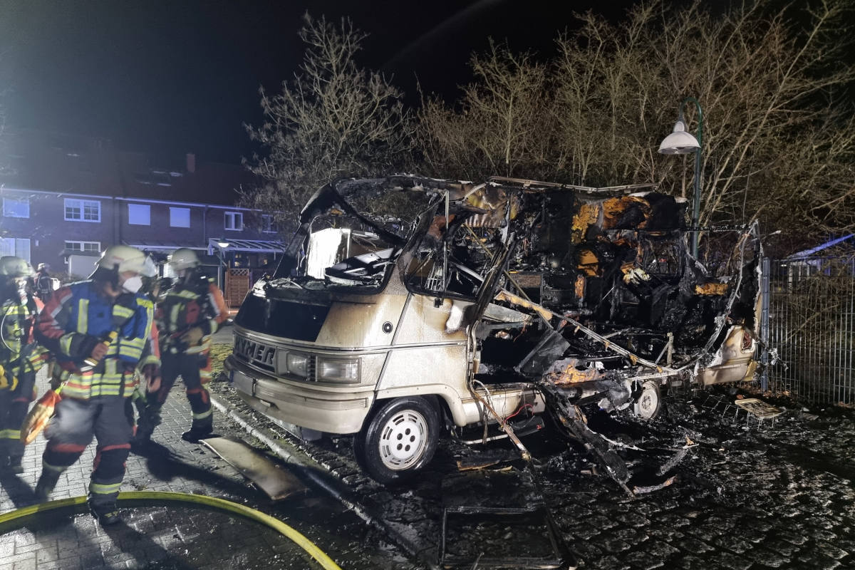Gegen 04:45 Uhr wurde darauf hin die Freiwillige Feuerwehr Harksheide alarmiert. Als die Kräfte wenige Augenblicke später vor Ort eintrafen, bestätigte sich die Lage. Ein Wohnmobil brannte in voller Ausdehnung. Durch zwei Atemschutztrupps der Feuerwehr konnte das Feuer schnell gelöscht und eine weitere Ausbreitung verhindert werden. Nach knapp zwei Stunden konnte der Einsatz beendet werden. Die Freiwillige Feuerwehr Harksheide war mit 23 Einsatzkräften und 5 Fahrzeugen im Einsatz.