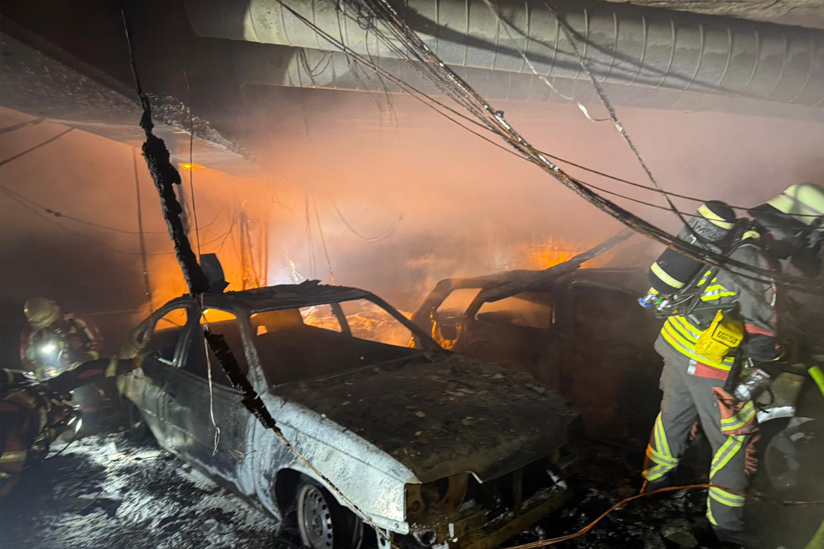 Tiefgarage festgestellt. Zusätzlich waren Knallgeräusche aus dem Inneren zu hören, was auf eine dynamische Brandausbreitung und möglicherweise explodierende Fahrzeugteile hindeutete.