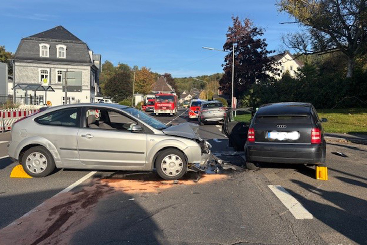 Am Donnerstag (02.10.2025) kollidierten in Nümbrecht-Homburg-Bröl zwei Autos, als ein 19-jähriger Fahrer beim Abbiegen einen entgegenkommenden Wagen übersah. Beide Fahrer wurden verletzt.