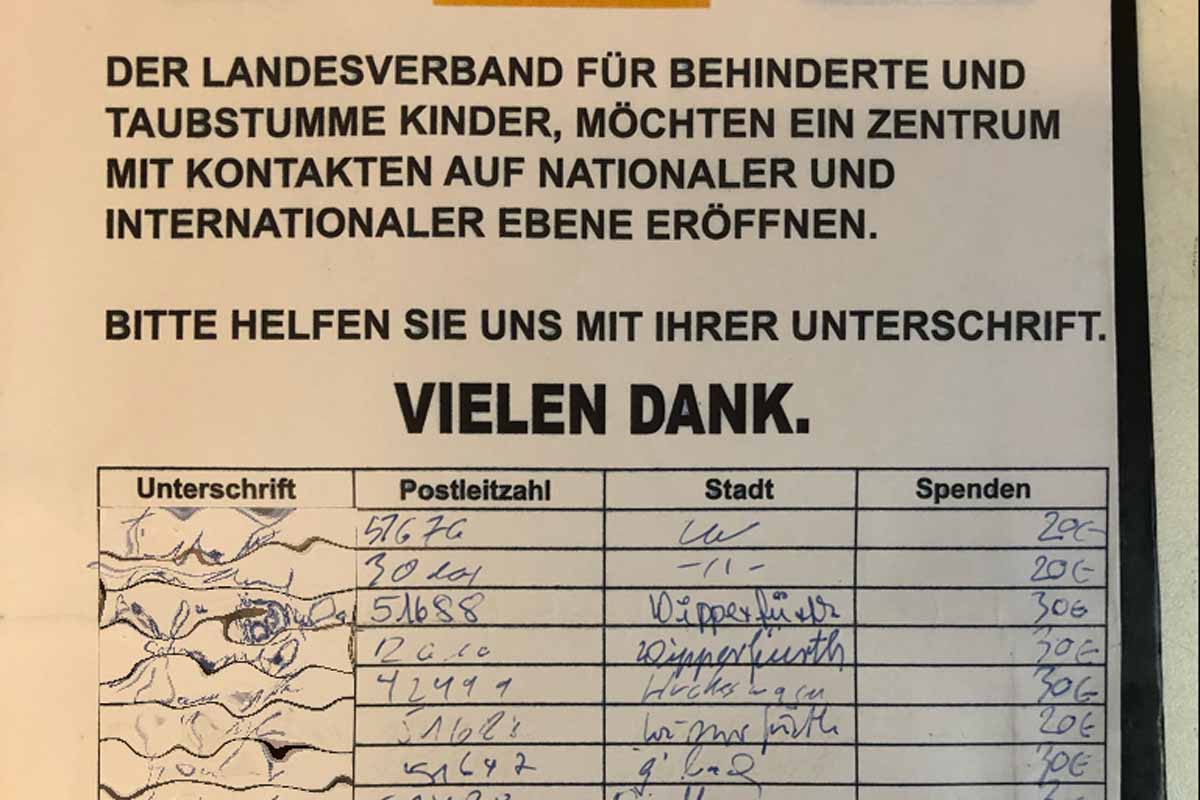 Angebliche Sammlungen für gehörlose Menschen sind immer wieder Anlass für polizeiliche Ermittlungen. Der Verbleib des Geldes ist in der Regel nicht nachvollziehbar. Wenn Sie Gutes tun und nicht in die Hände von Betrügern fallen wollen, sollten Sie sich nicht unter Druck setzen lassen und sich vor einer Spende über deren Seriosität informieren.