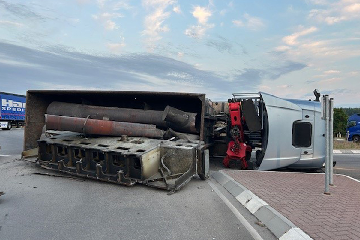 Kurz nach Einfahrt in den Kreisverkehr kippte sein Lkw, der mit einem Großraum-Container und innenliegenden großen Metallteilen beladen war, auf die rechte Seite.