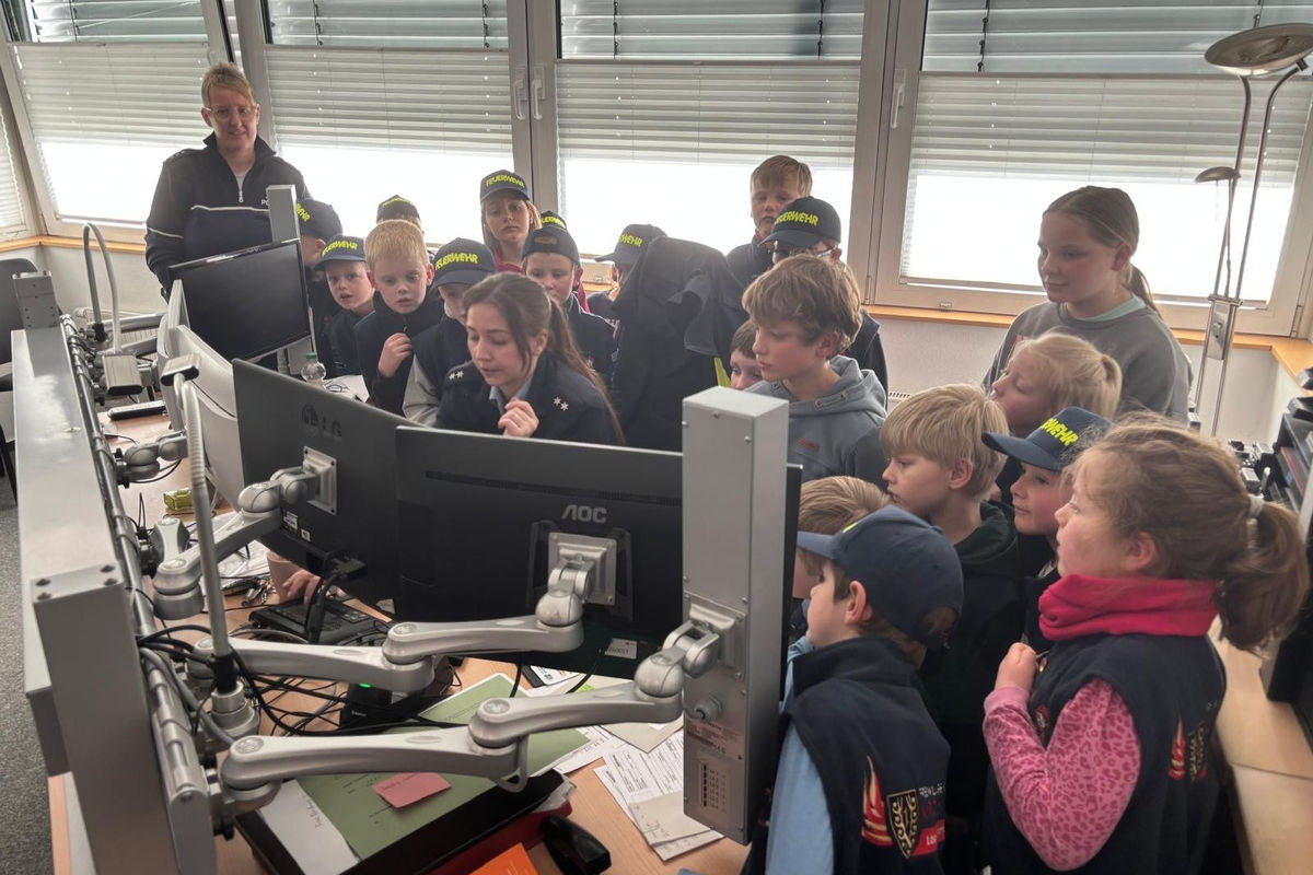 Kinder herzlich von den Polizistinnen Tanja und Lisa empfangen. Bei einer Führung durch die Wache erhielten die LöschKids spannende Einblicke in den Arbeitsalltag der Polizei. Unter anderem konnten sie mehrere Zellen besichtigen und einen Blick in den Einsatzleitungsraum werfen, der bei größeren Einsätzen oder besonderen Krisensituationen genutzt wird. Auch der Arbeitsplatz, an dem per Computer nach vermissten Personen gesucht und Fahndungen bearbeitet werden, stieß auf großes Interesse.