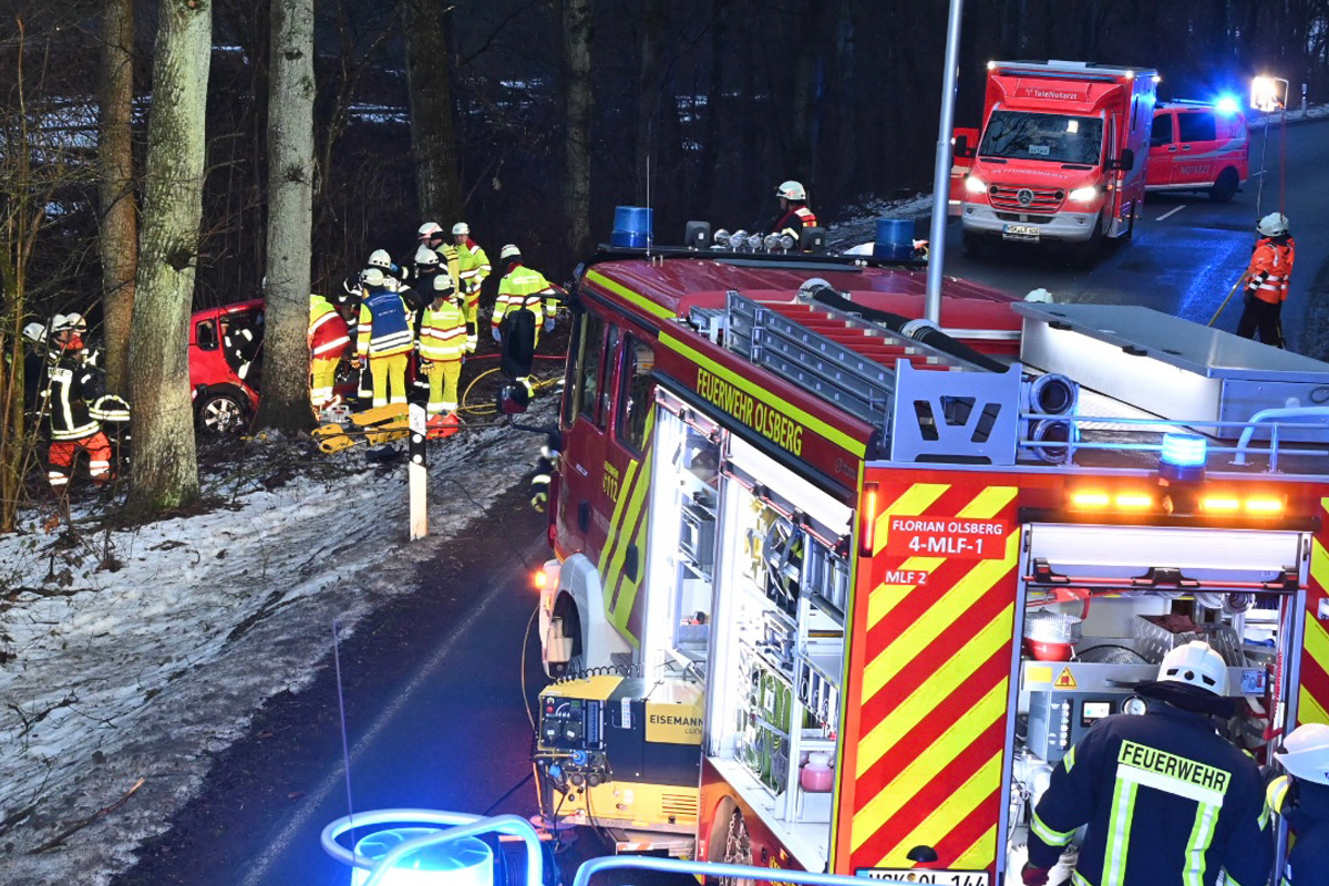 Am Dienstagmorgen, 13.01.2026, kam es auf der Kreisstraße 15 bei Olsberg-Gevelinghausen (NW) zu einem schweren Verkehrsunfall. Ein 18-Jähriger verlor die Kontrolle und prallte gegen einen Baum. Der junge Mann wurde schwer verletzt und musste von der Feuerwehr befreit werden.