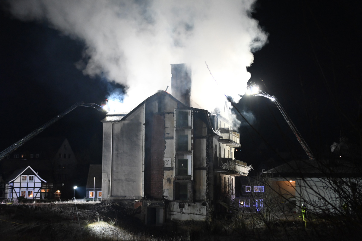 Freiwillige Feuerwehr Olsberg. Aufgrund der alten und ungenutzten Bausubstanz entschieden sich die Einsatzkräfte aus Gründen des Eigenschutzes für einen reinen Außenangriff. Zur Unterstützung wurde die Drehleiter des Löschzuges Brilon als zweite Drehleiter nachgefordert.