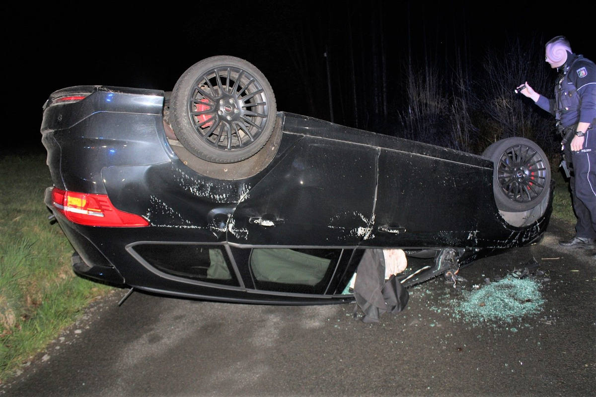 Pkw überschlägt sich auf regennasser Fahrbahn (Bildquelle: Polizei Rheinisch-Bergischer Kreis)
