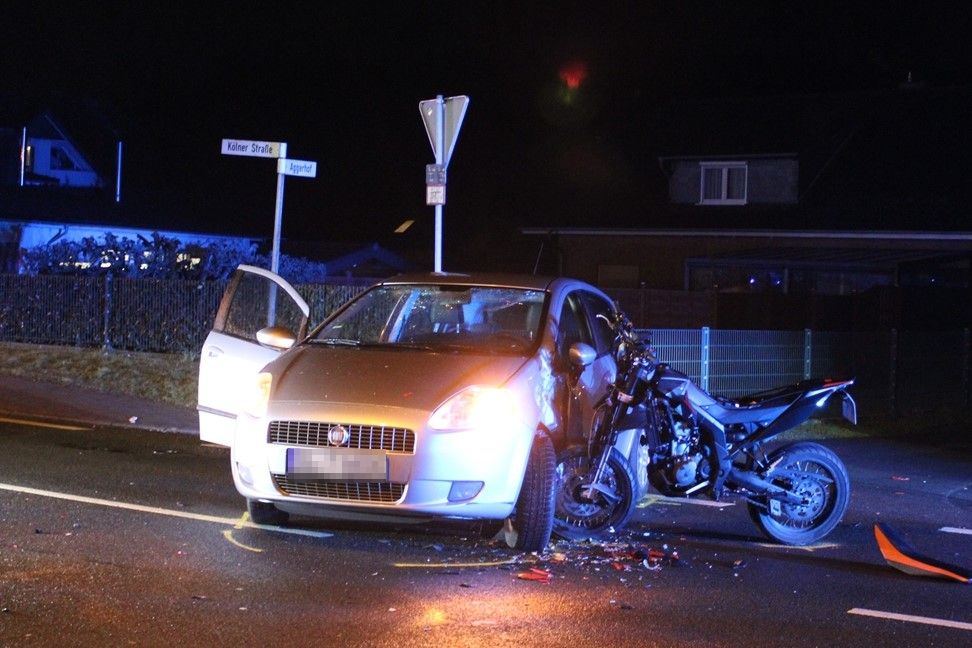 Am Sonntagabend (05.03.) ereignete sich gegen 22:25 Uhr im Ortsteil Vilkerath ein folgenschwerer Verkehrsunfall zwischen einem Pkw und einem Leichtkraftrad. Der Fahrer des Leichtkraftrades wurde hierbei schwer verletzt.