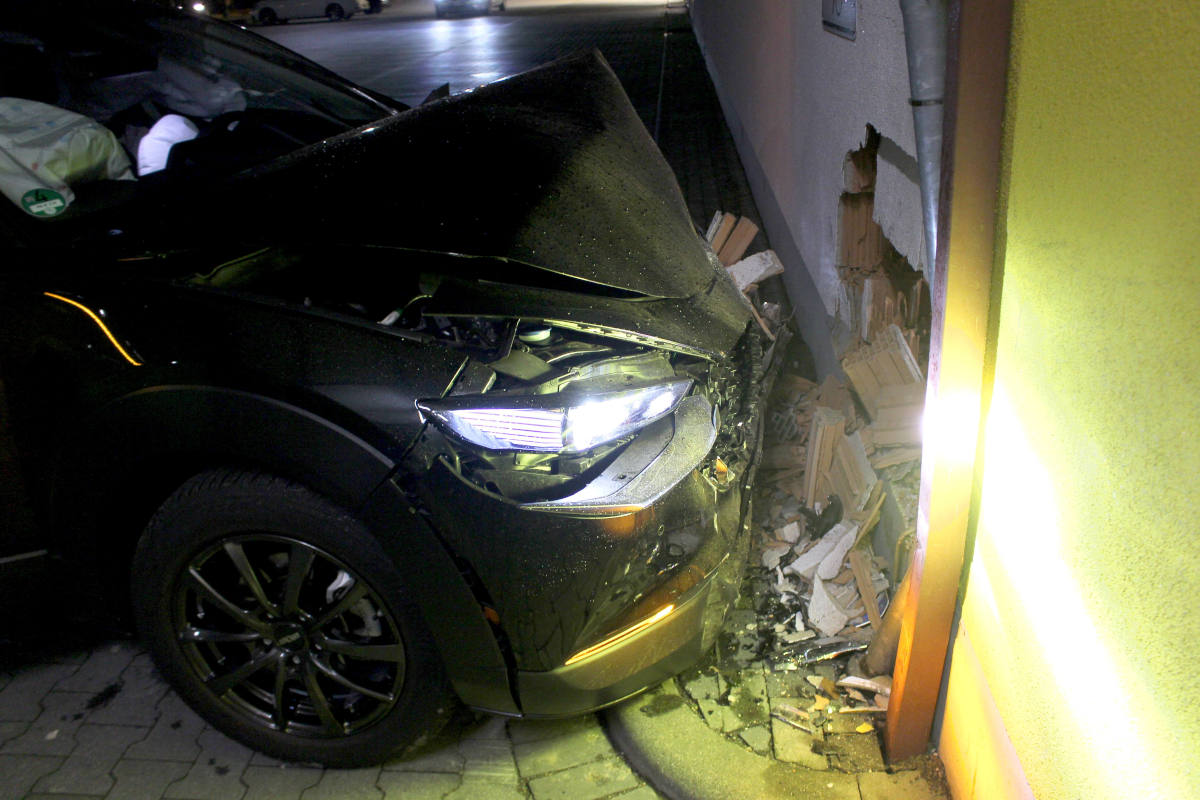 Eine Mitarbeiterin des Supermarkts hörte gegen 07:10 Uhr ein lautes Geräusch. Dann flogen mehrere Kartons mit Weinflaschen aus einem an der Außenwand des Gebäudes stehenden Warenregals. Die Zeugin stellte fest, dass Mauersteine nach innen aus der Wand gebrochen waren. Ein Auto war frontal gegen die Wand neben dem Unterstand für die Einkaufswagen geprallt und hatte das Mauerwerk durchbrochen. Der schwarze Mazda CX30 stand schwer beschädigt mit ausgelösten Airbags und eingeschaltetem Licht am Unfallort. Eine Fahrerin oder einen Fahrer war nicht in Sicht.