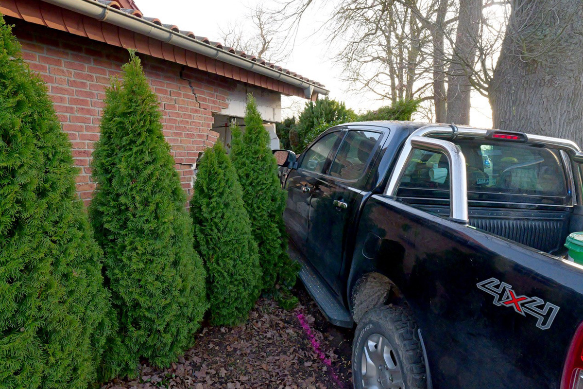 Im Kreuzungsbereich kam es zu einem Zusammenstoß zwischen zwei Pkw. Durch den Aufprall kam eines der Fahrzeuge von der Fahrbahn ab und prallte gegen die Wand einer Garage.