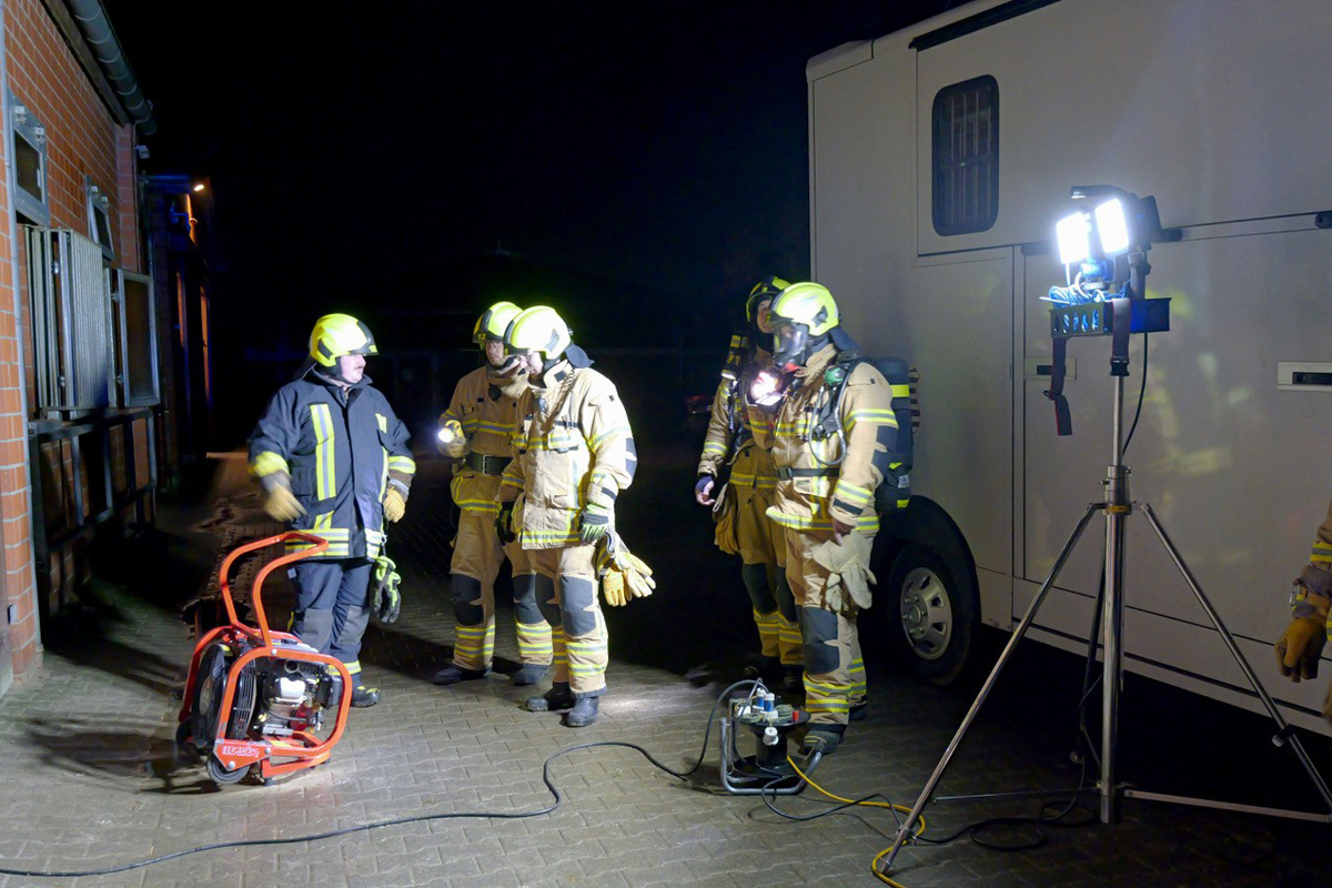 Mit einer Überdruckbelüftung verhinderte die Feuerwehr eine Rauchvergiftung der Pferde. (Bildquelle: Feuerwehr Paderborn)
