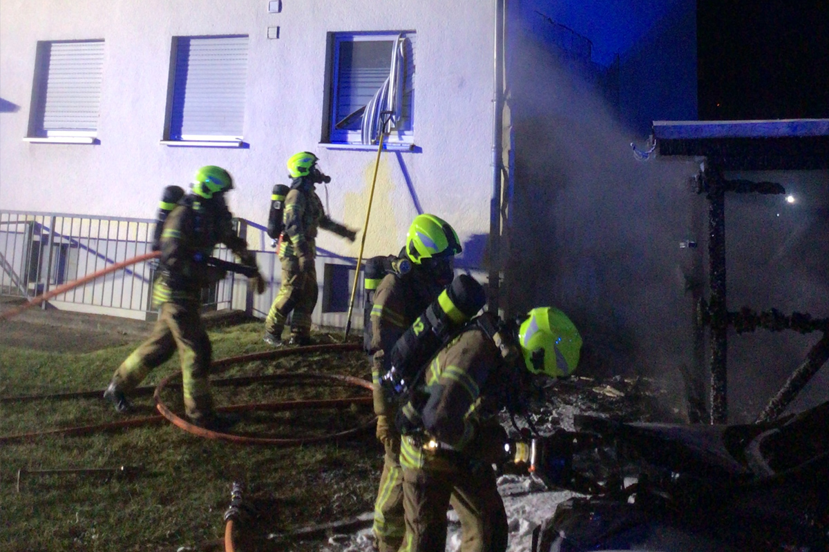 Bei Eintreffen der ersten Einsatzkräfte wurde ein in Vollbrand befindlicher Mülltonnenunterstand vorgefunden, welcher sich bereits auf einen danebenstehenden PKW ausgebreitet hatte und auf ein in unmittelbarer Nähe befindliches Mehrparteienhaus sowie einen Garagenkomplex überzugreifen drohte.