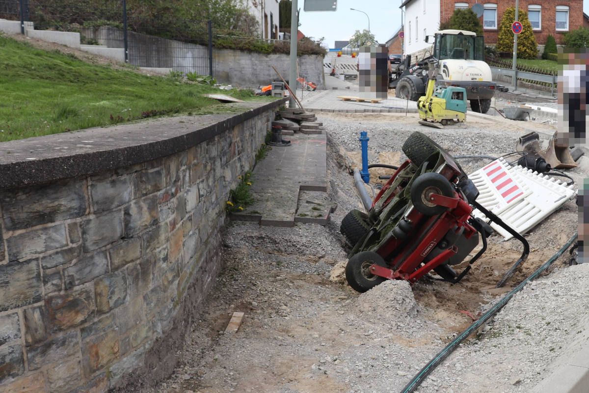 Der 31-Jährige kippte mit dem Mähfahrzeug über die Mauerkante und stürzte in die Straßenbaustelle an der Ecke. Bauarbeiter kamen dem unter dem Mäher eingeklemmten, schwer verletzten Mann zur Hilfe und befreiten ihn. Mit einem Rettungswagen wurde der Verletzte in ein Krankenhaus gebracht.
