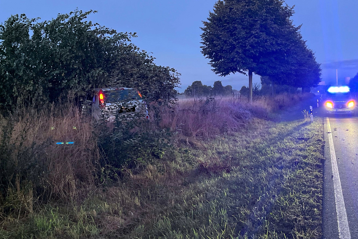 Ein 24-jähriger Autofahrer ist am Montagmorgen (25.08.2025) auf der L770 bei Petershagen von der Straße abgekommen und gegen einen Baum geprallt. Der Wagen drehte sich und kam im Grünstreifen zum Stehen.