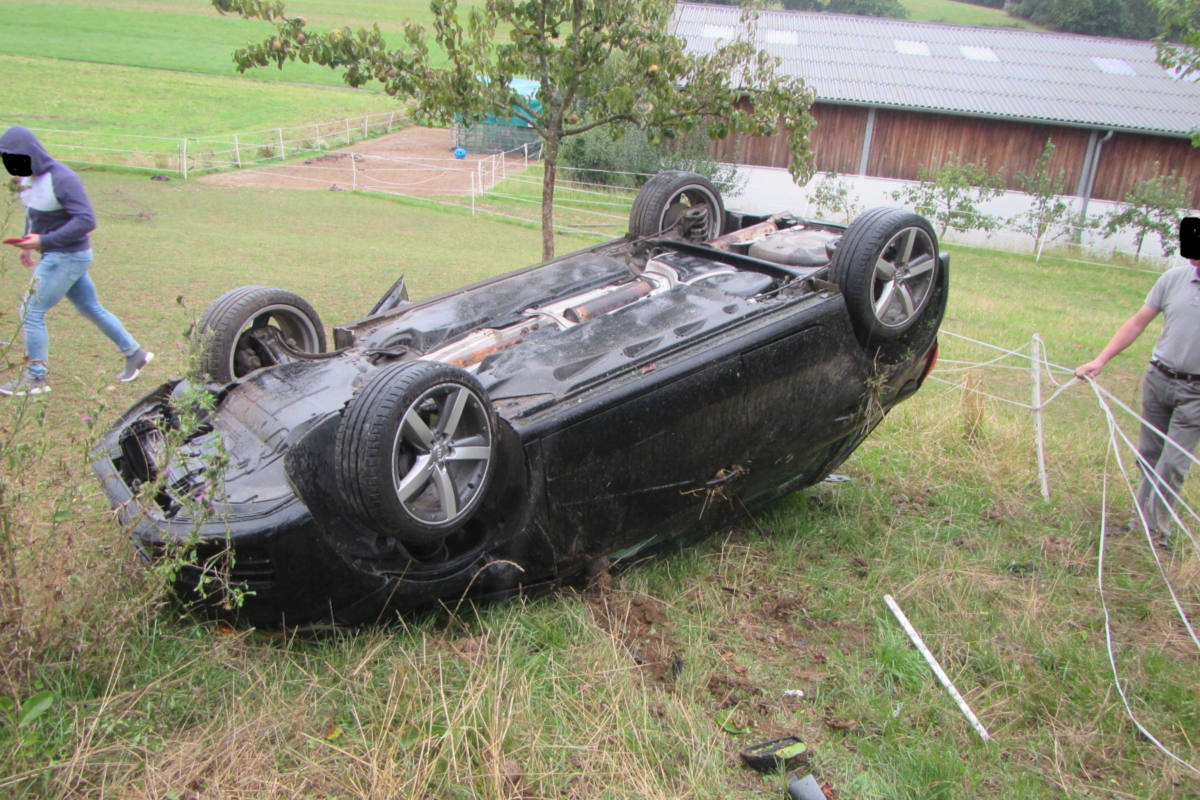 Der Fahrer sowie ein weiterer Mitfahrer blieben unverletzt. Der Beifahrer zog sich Schürfwunden und ein Platzwunde zu. Er wurde zur medizinischen Erstversorgung in ein Krankenhaus verbracht. Am Fahrzeug entstand ein wirtschaftlicher Totalschaden in Höhe von ca. 15.000 EUR.