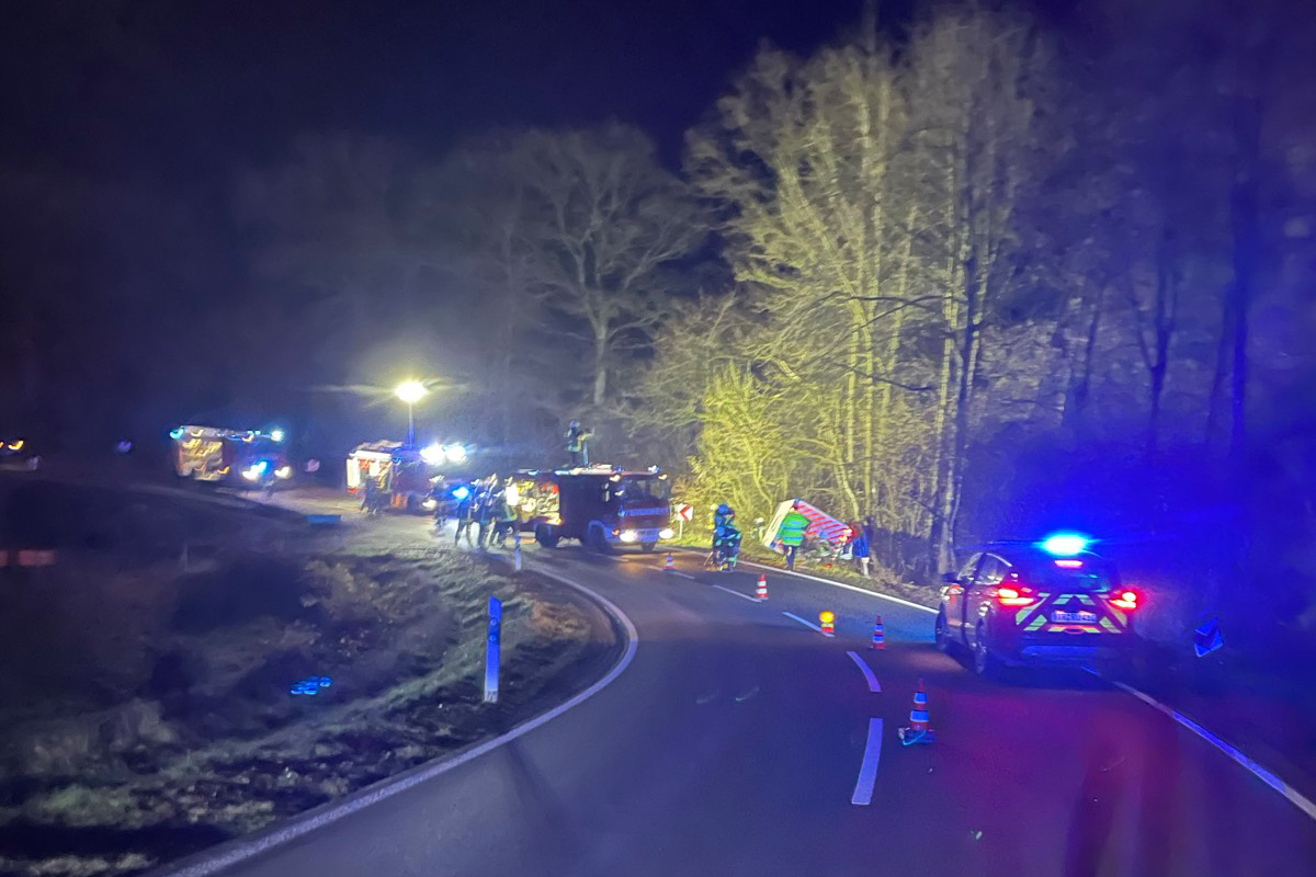 Ein Rettungswagen, der sich ohne Einsatzfahrt auf der Landstraße befand, war auf der abschüssigen Strecke unterwegs, als er aus bislang ungeklärter Ursache in einer scharfen Linkskurve nach rechts von der Fahrbahn abkam.