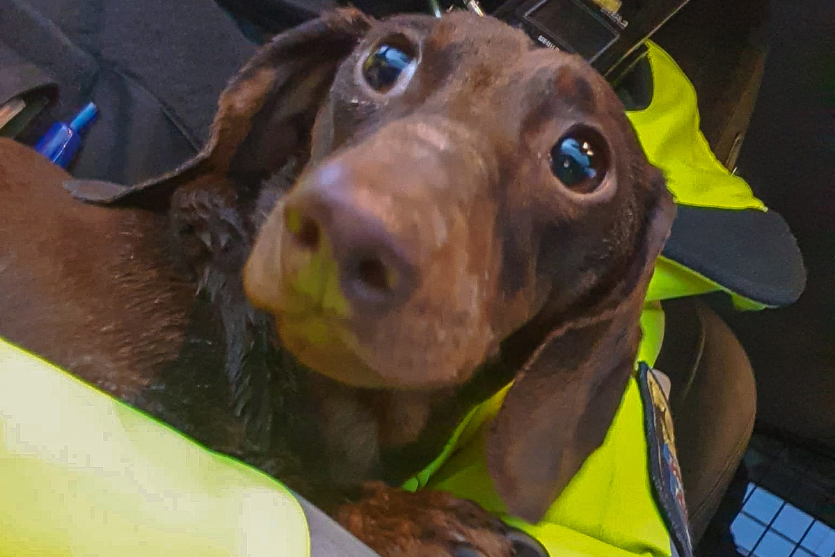 Nach dem Ende des Nachtdienstes brachte der fürsorgliche Beamte den Dackel zu seinem Frauchen ins Krankenhaus, nachdem diese dort wieder entlassen werden konnte.