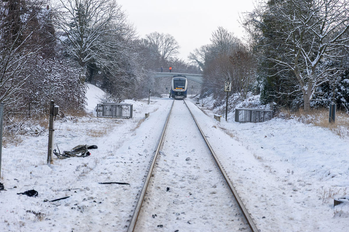 Ein Autofahrer hat am Dienstagvormittag, 27.01.2026, in Porta Westfalica einen geschlossenen Bahnübergang umfahren und ist mit einem Zug kollidiert. Der Mann flüchtete zunächst zu Fuß, konnte aber kurz darauf von der Polizei gestellt werden.