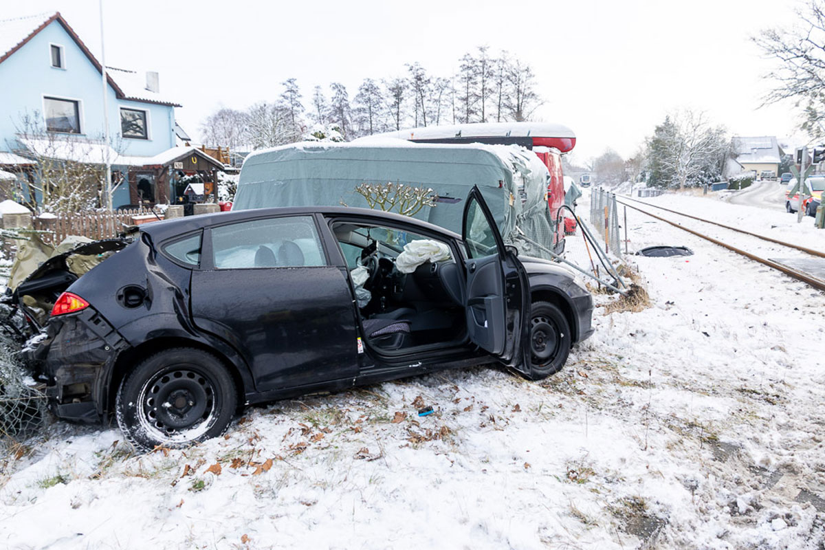 Trotz sofort eingeleiteter Notbremsung konnte der Zugführer die Kollision nicht verhindern. Der Pkw schleuderte auf ein angrenzendes Grundstück und prallte dort gegen einen abgestellten Wohnwagen.