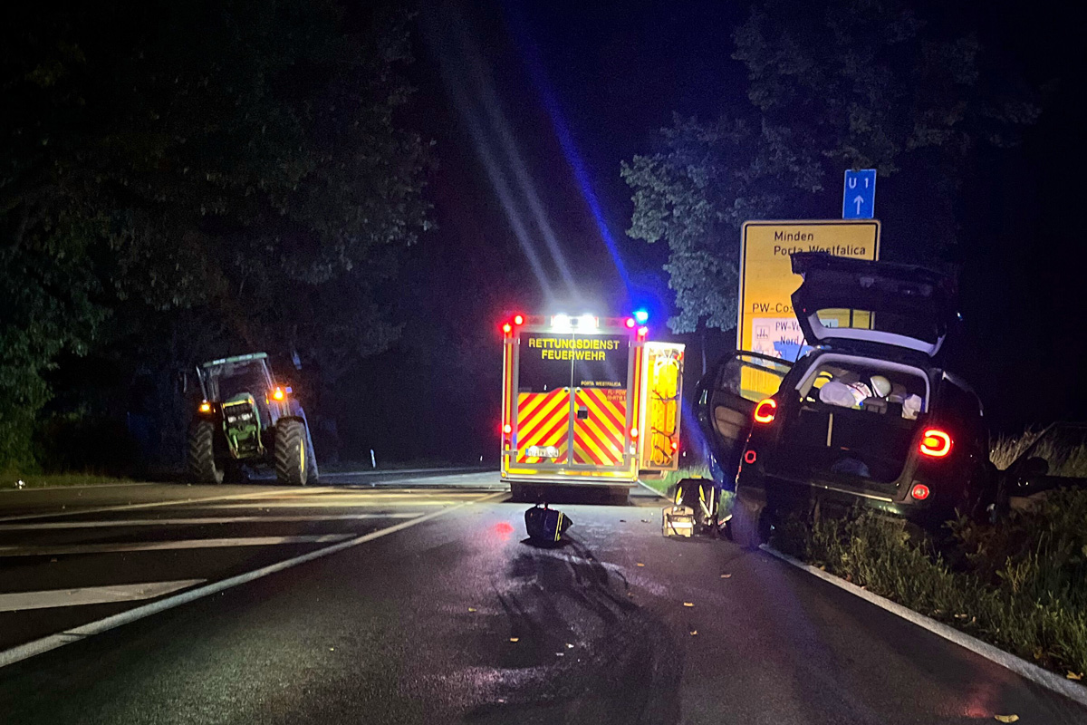 Am 16.08.2025 gegen 01:10 Uhr kam es auf der B482 in Porta Westfalica zu einem Verkehrsunfall zwischen einem Auto und einem Traktor.