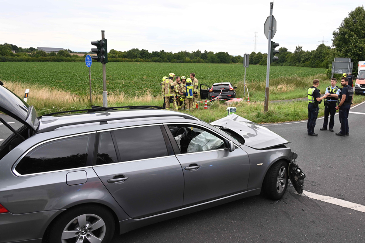Bei Eintreffen der Kräfte fanden diese zwei PKW vor, wobei ein verunfalltes Fahrzeug mitten auf der Kreuzung stand. Das andere war von der Straße offensichtlich über den Fahrradweg in den Seitenstreifen geschleudert worden.