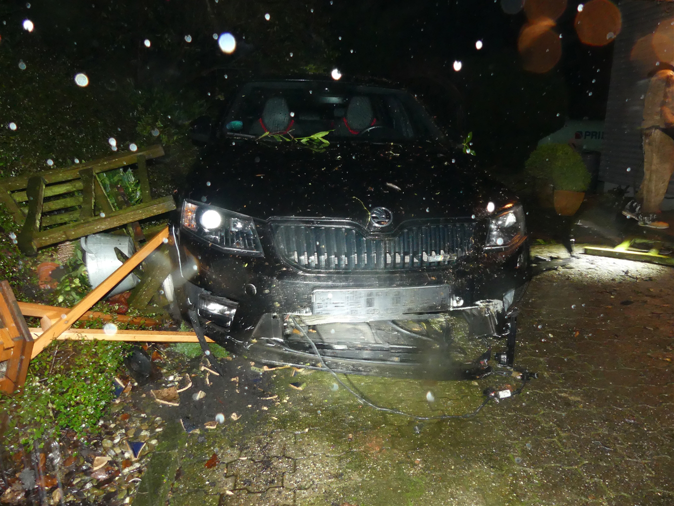 Nach bisherigen Erkenntnissen fuhr der 41-Jährige mit seinem Skoda auf der Hölterhofer Straße und kam in einer scharfen Rechtskurve von der Fahrbahn ab. Er beschädigte einen Holzzaun und Gartenmöbel und kam schließlich unmittelbar vor der Hauseingangstür eines Wohnhauses zum Stehen. An dem Skoda entstand erheblicher Sachschaden. Er war nicht mehr fahrbereit und musste abgeschleppt werden. Der Fahrer kam augenscheinlich von einer Karnevalsveranstaltung. Er wirkte alkoholisiert. Ein Atemalkoholtest bestätigte bei einem Wert von etwa 2,1 Promille diesen Verdacht. Der Hückeswagener musste eine Blutprobe und seinen Führerschein abgeben.