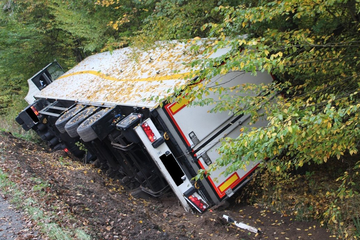 Dabei geriet das Fahrzeug auf den Grünstreifen, wo der Fahrer die Kontrolle verlor und mit seinem Lastwagen in den angrenzenden Graben rutschte.