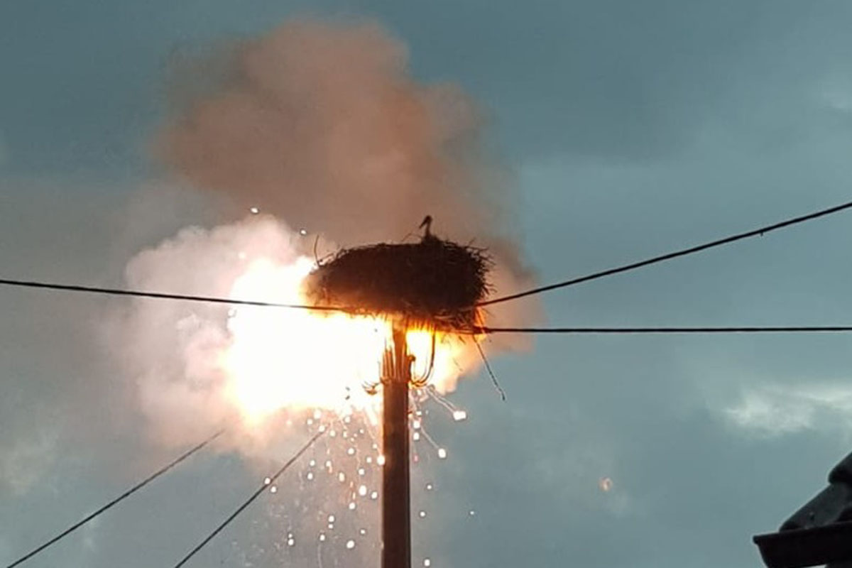 Nach einem Blitzeinschlag am Mittwochmorgen waren Einsatzkräfte verschiedener Behörden und Einrichtungen nötig, um zwei Jungstörche noch rechtzeitig zu retten.