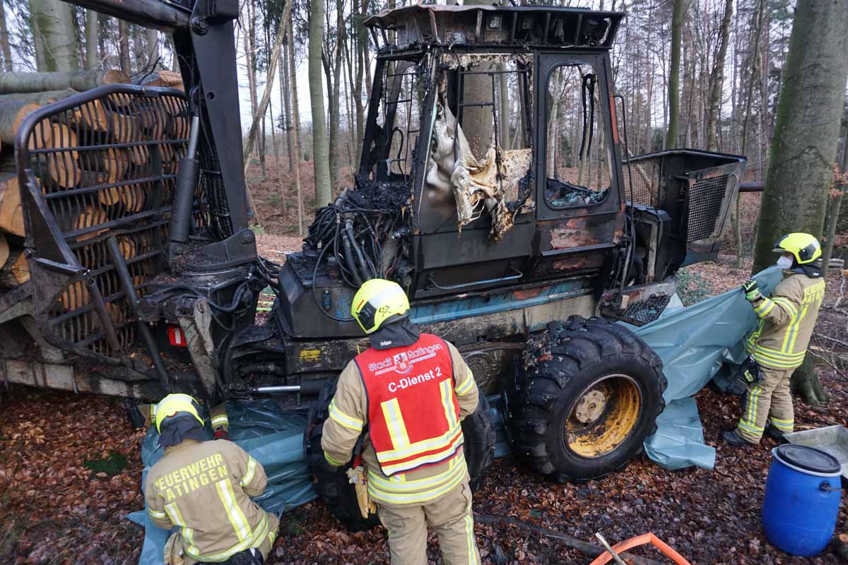 Bei Waldarbeiten war gestern dort ein bereits mit ca. 10 Tonnen Holz beladener sogenannter Rückezug in Brand geraten. Der Fahrer des Arbeitsgerätes konnte sich leichtverletzt befreien.