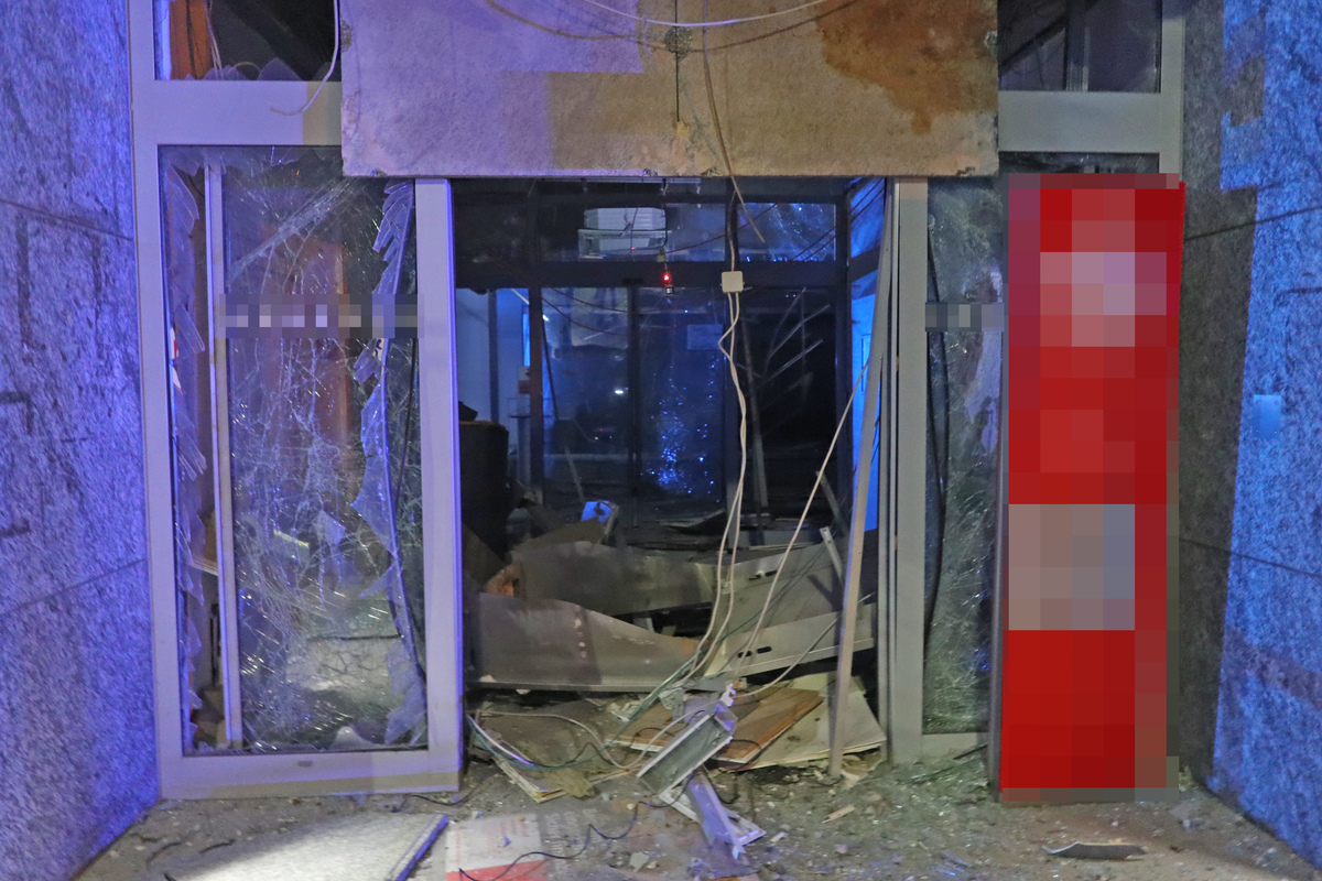 Unterdessen stellten weitere Polizeibeamte vor Ort im Rahmen ihrer Tatortaufnahme fest, dass ein in der Filiale der Bank aufgestellter Geldautomat aufgesprengt worden war. Zudem waren die Räumlichkeiten des Geldinstituts ganz erheblich in Mitleidenschaft und zerstört worden: So war die Eingangstür aus ihrer Verankerung gerissen, Deckenteile hingen herab und mehrere Schaufenster waren aufgrund der Wucht der Detonation mehrere Meter weit auf die Straße geschleudert worden.