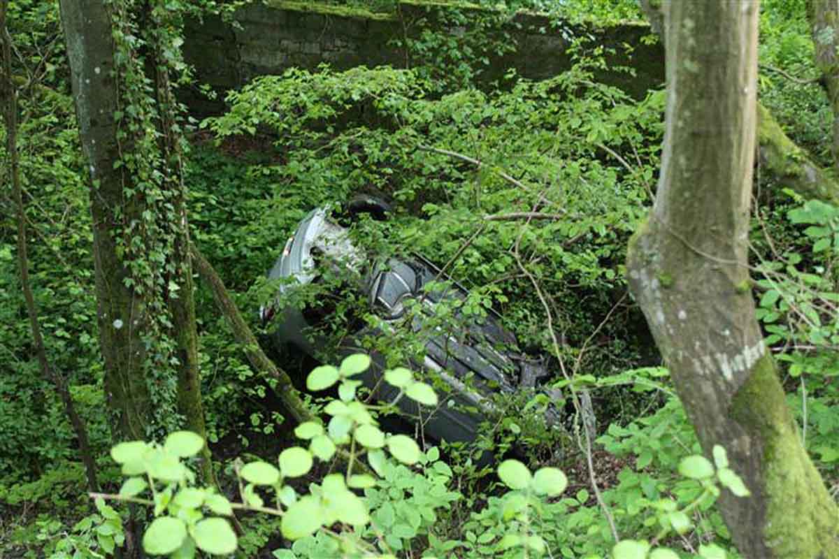 In einer Linkskurve stieß der Fahrzeugführer gegen den rechten Bordstein und schleuderte dann auf der gegenüberliegenden Seite einen ca. 10 Meter hohen Abhang hinunter.