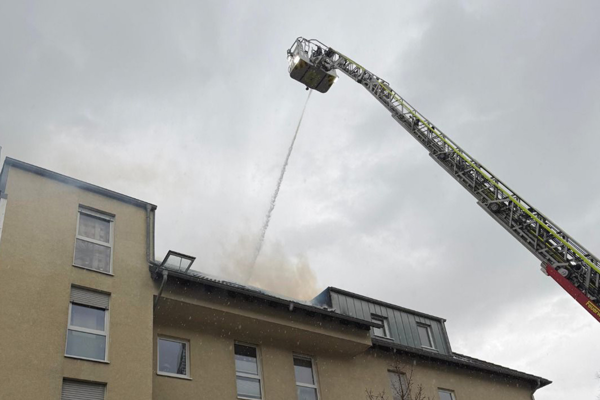 Beim Eintreffen der ersten Einsatzkräfte stand eine Dachgeschosswohnung bereits in Vollbrand, das Feuer hatte auf den Dachstuhl übergegriffen. Die Alarmstufe wurde auf „Dachstuhlbrand“ erhöht und weitere Kräfte nachalarmiert.