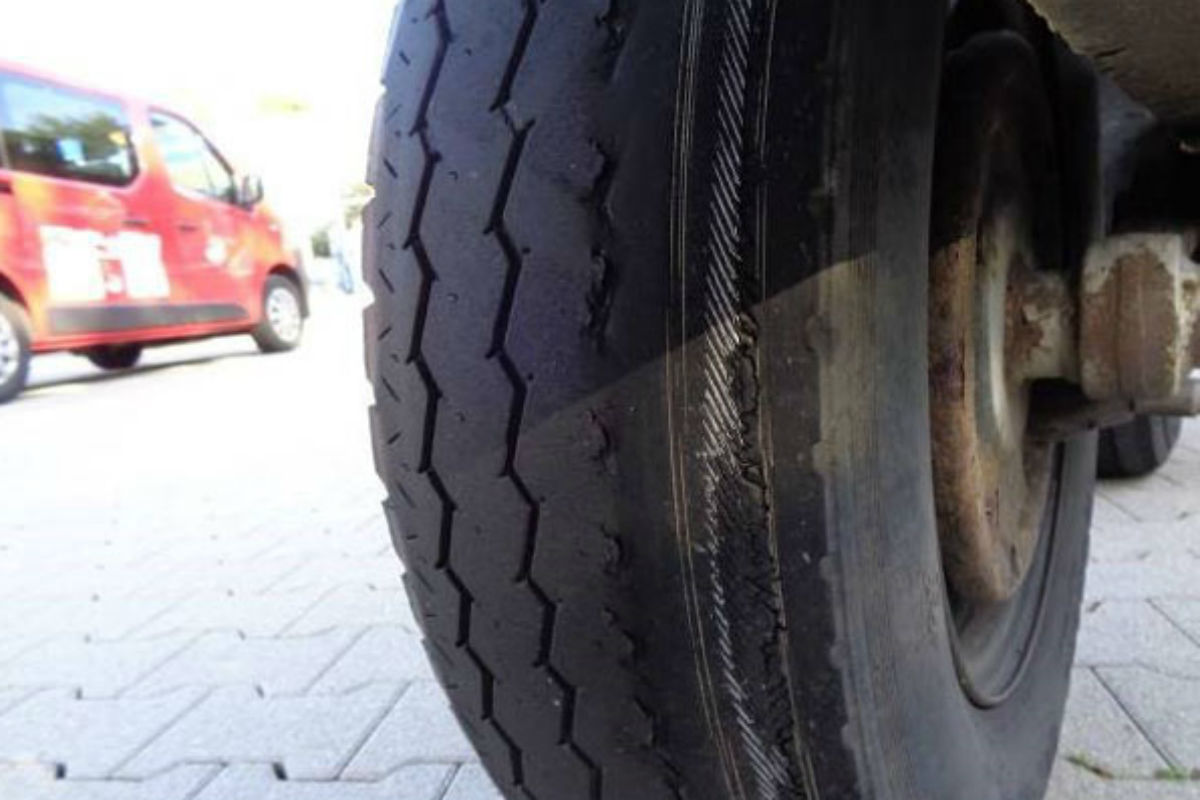 Neben der defekten Lenkung war ein Reifen derart abgefahren, dass er kurz vor dem Platzen stand (Foto). Eine Bremsscheibe war gerissen. Funktionierende Beleuchtung? Fehlanzeige. Die Beamten zogen einen Sachverständigen zu Rate. Der bestätigte die akute Verkehrsgefährdung und legte das Gespann sofort still. Die Weiterfahrt wurde untersagt. Insgesamt standen 84 Mängel auf dem Untersuchungsbericht.