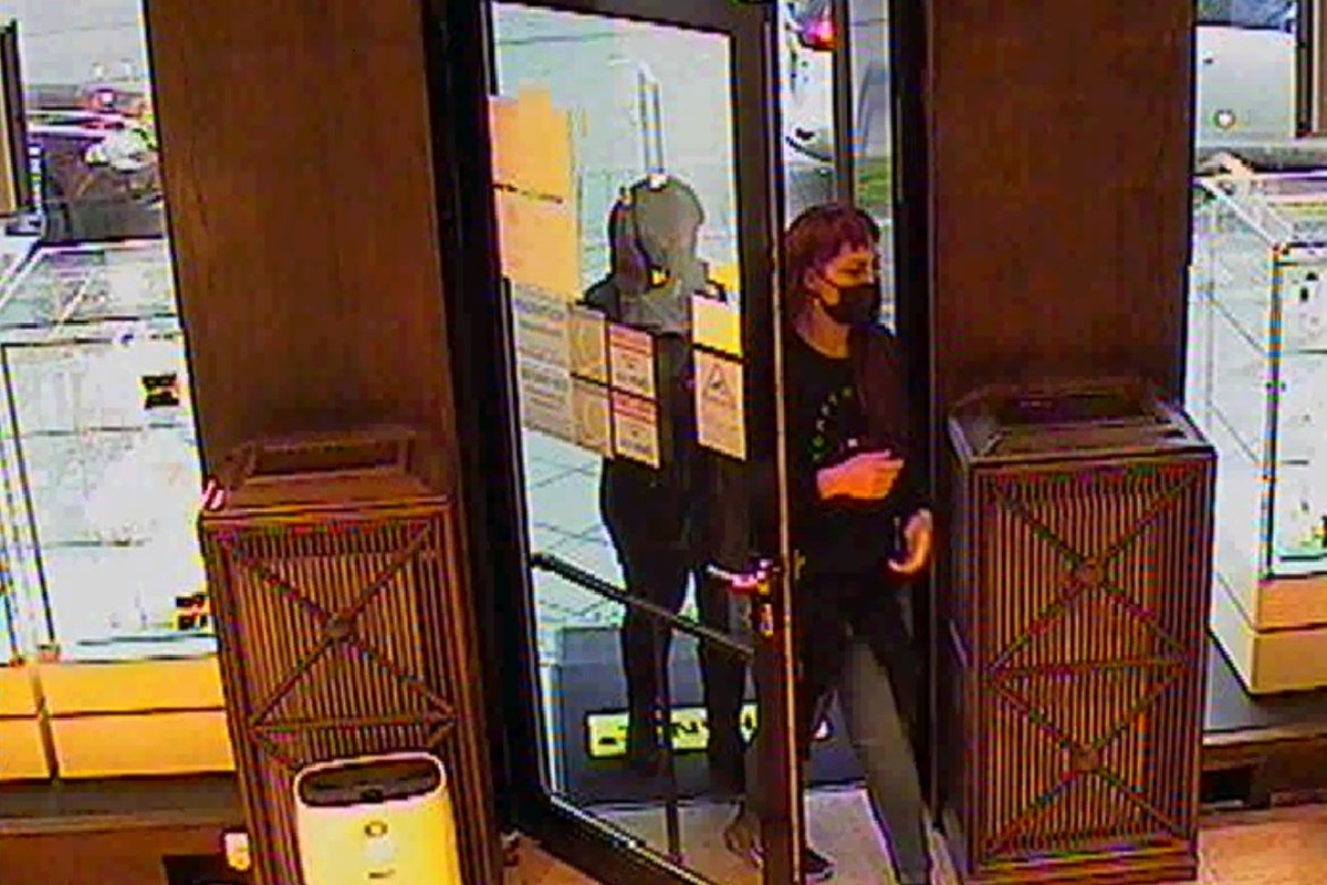 Tatverdächtige 2: trägt schwarze Turnschuhe, blaue Jeans und schwarzen Pullover, trägt vermutlich rote Perücke, trägt schwarzen Mund-Nasenschutz