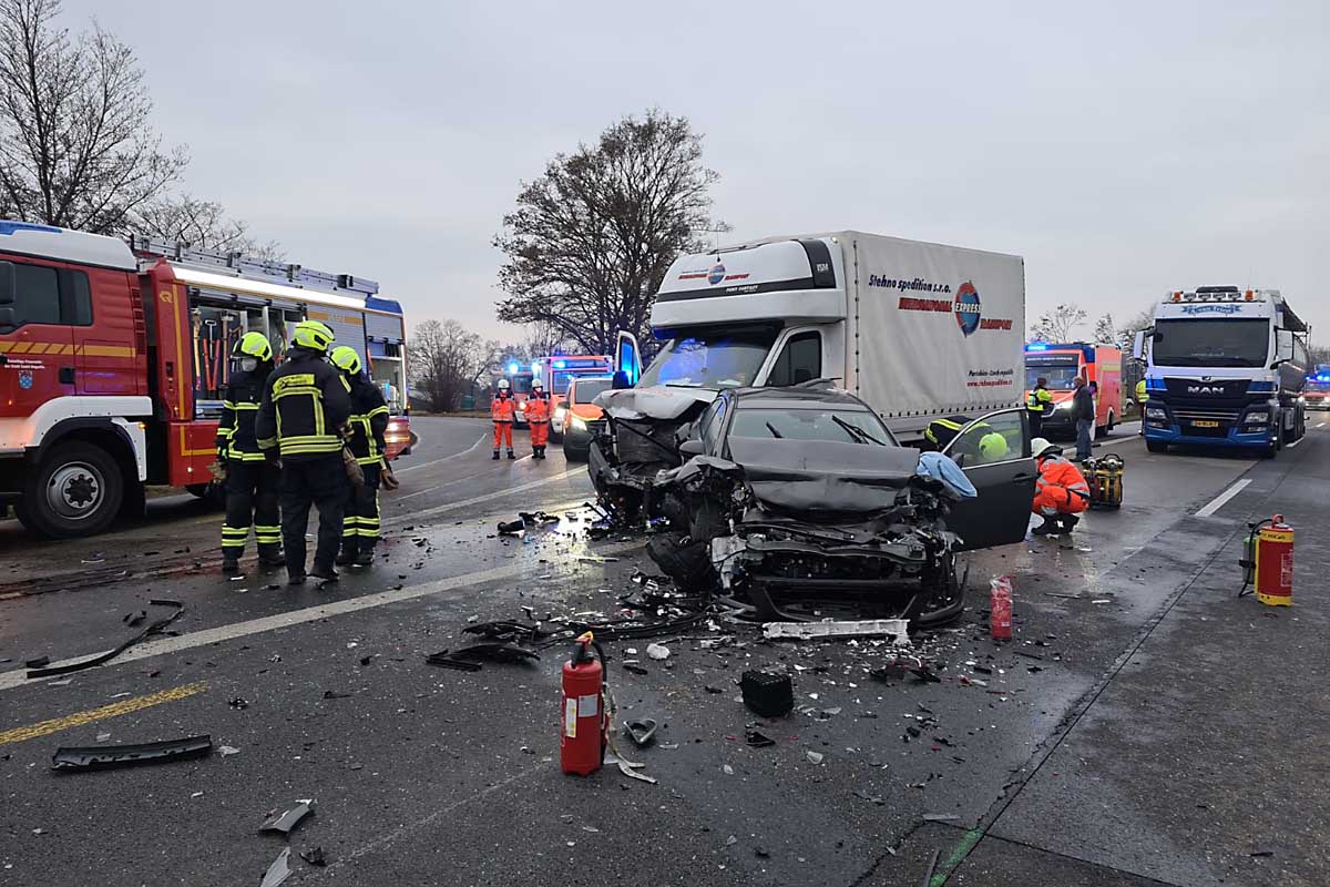 Es handelte sich um einen Auffahrunfall zwischen einem LKW, einem PKW und einem Kleintransporter. Hierbei geriet der PKW zwischen die beiden Nutzfahrzeuge. Die Autofahrerin wurde heute verletzt in ihrem PKW eingeschlossen.