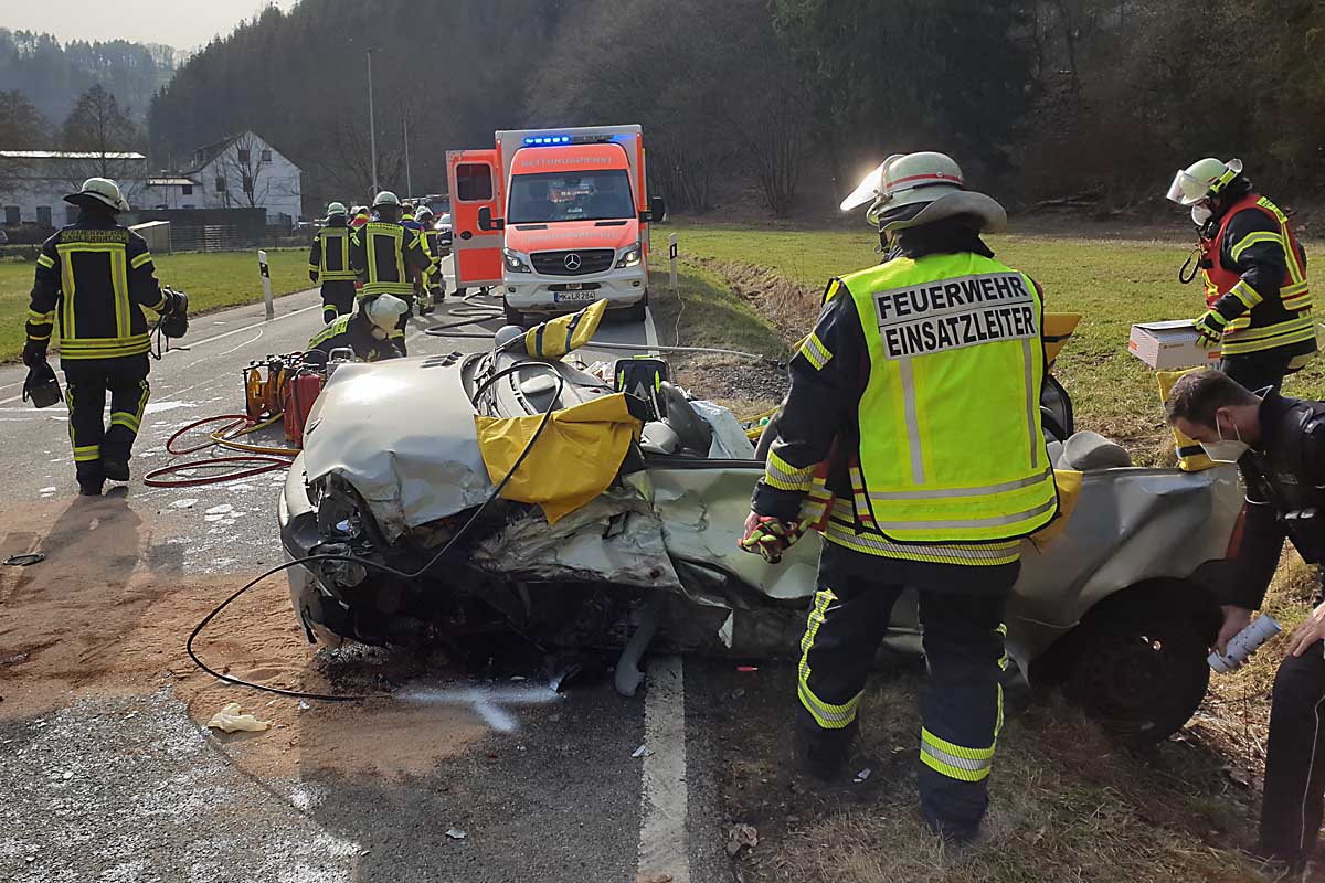 Die Einsatzkräfte der Feuerwehr leiteten die technische Rettung mit einer hydraulischen Rettungsschere ein. Zur Befreiung der eingeklemmten Person wurde das Dach des PKW abgenommen, indem die Säulen des Fahrzeugs mit der Rettungsschere durchtrennt wurden.
