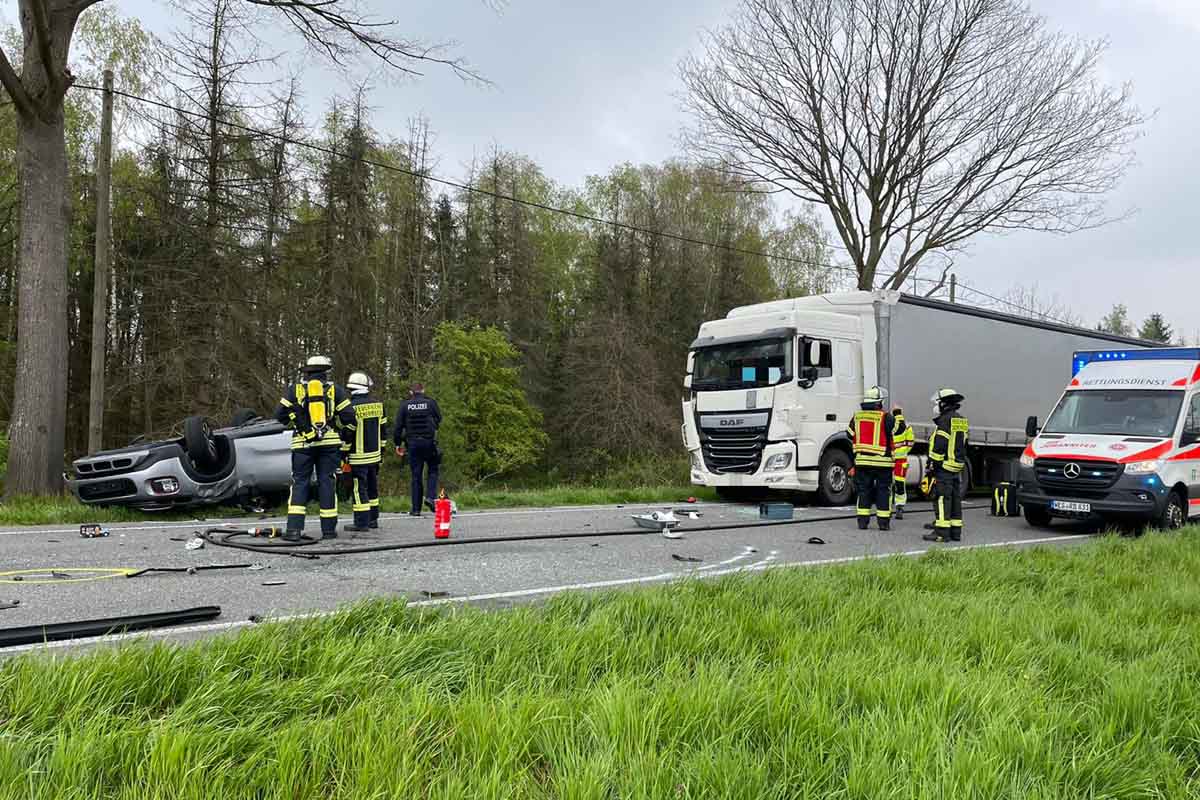 Zuvor war es hier zu einem Verkehrsunfall gekommen, bei dem der PKW mit einem LKW kollidierte. Durch die Wucht des Aufpralles, drehte sich der PKW und kollidierte anschließend mit einem weiteren LKW wodurch sich der PKW überschlug.