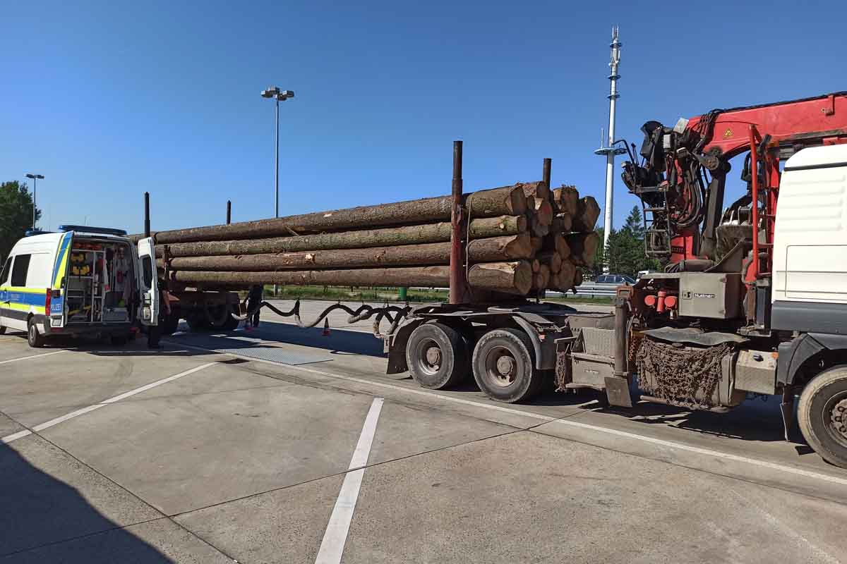 In diesem Zusammenhang wurde auch ein Langholztransport aus dem Landkreis Greiz der Kontrollstelle zugeführt. Dieser war um mehr als 10 Tonnen überladen und die Fahrzeuglänge entsprach nicht den gesetzlichen Vorschriften.