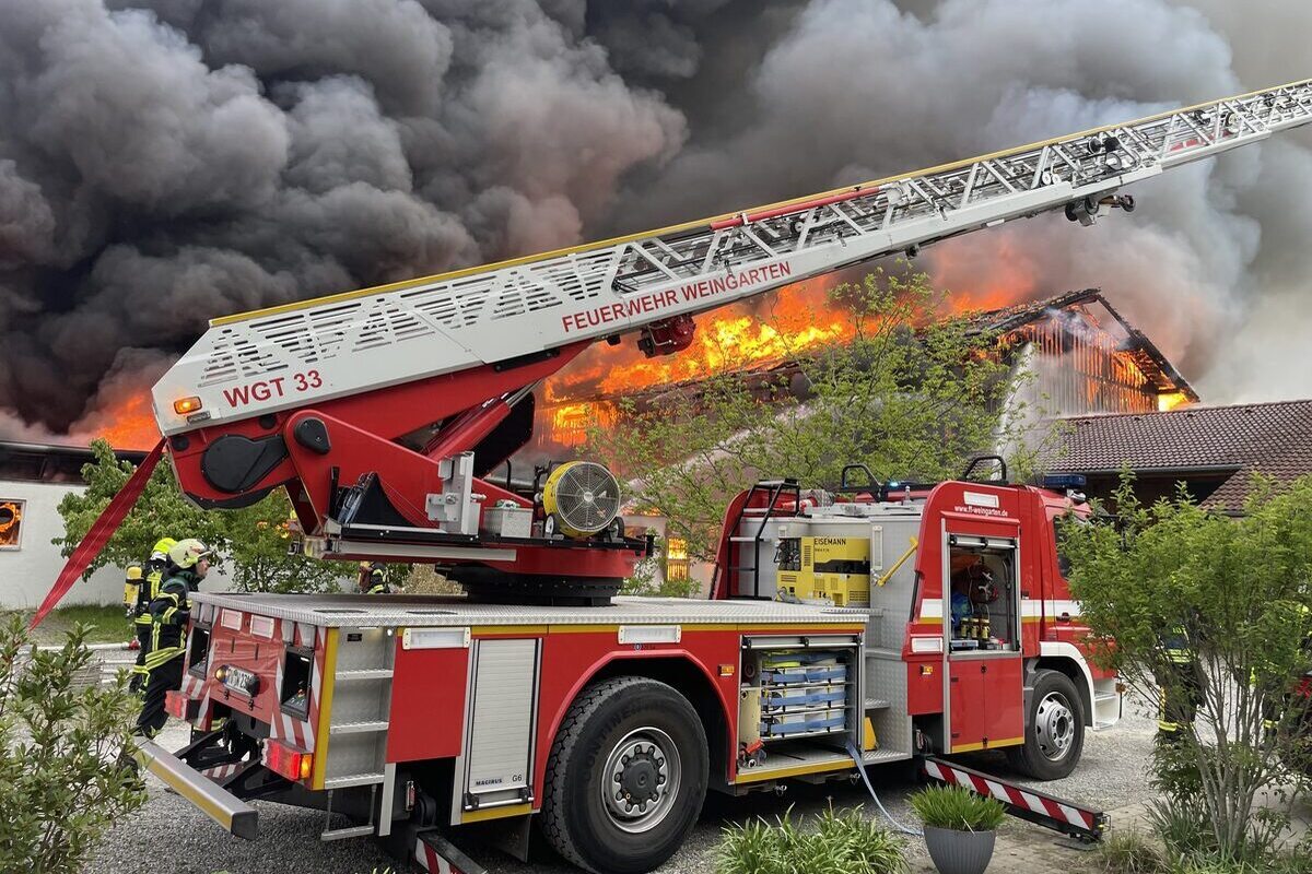 Ein Großbrand zerstörte am Sonntagmorgen zwei Lagerhallen in der Gemeinde Schlier.