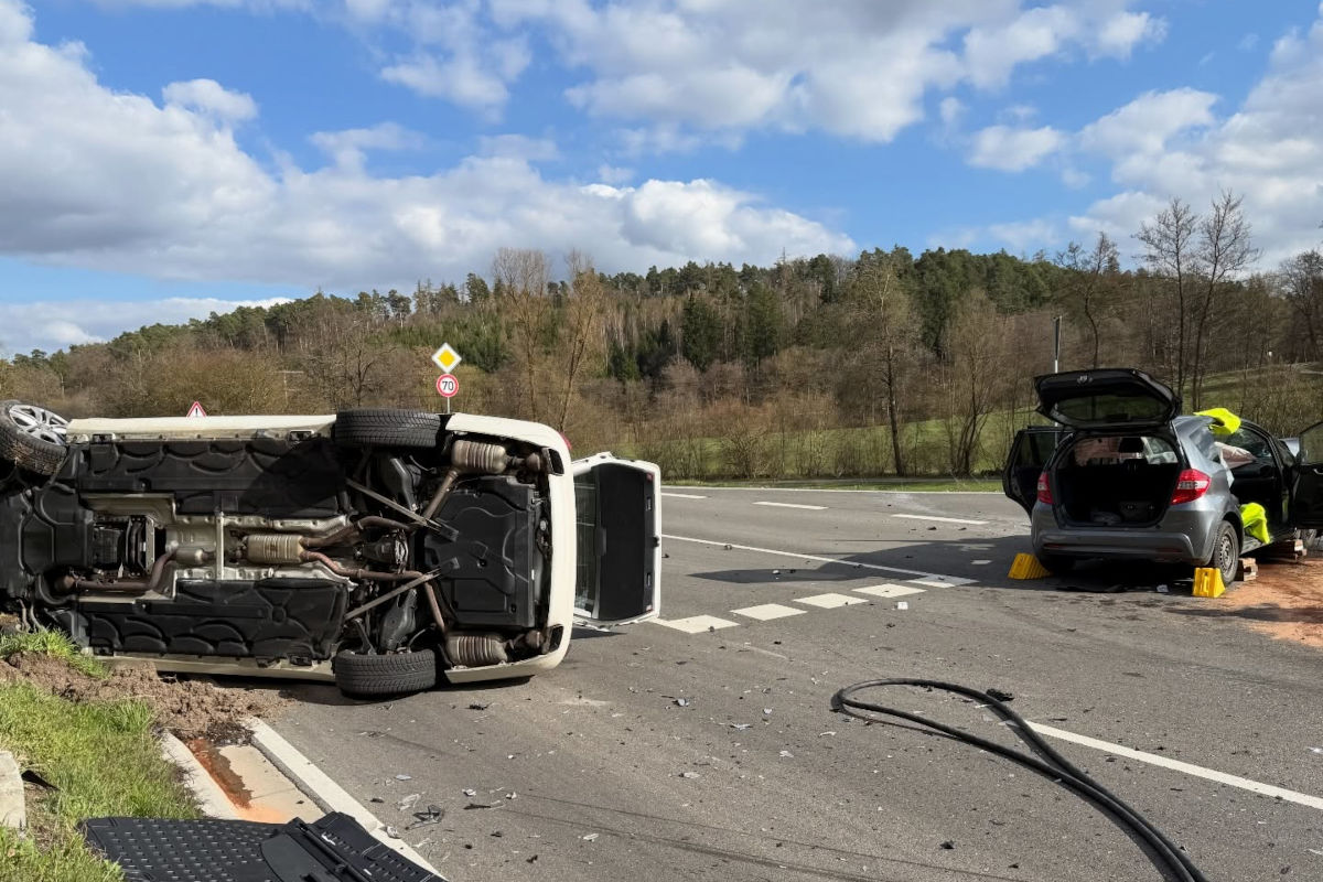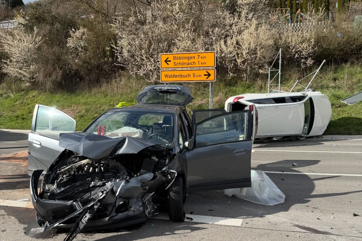 Dabei übersah er nach ersten Ermittlungen zufolge einen aus Richtung Schönaich kommenden Mercedes eines 49-Jährigen. Im Einmündungsbereich kam es zur Kollision der beiden Fahrzeuge. Durch den Zusammenstoß wurde der Honda gedreht, der Mercedes wurde von der Fahrbahn nach links abgewiesen, wo er an einem Erdwall auf die rechte Fahrzeugseite kippte.