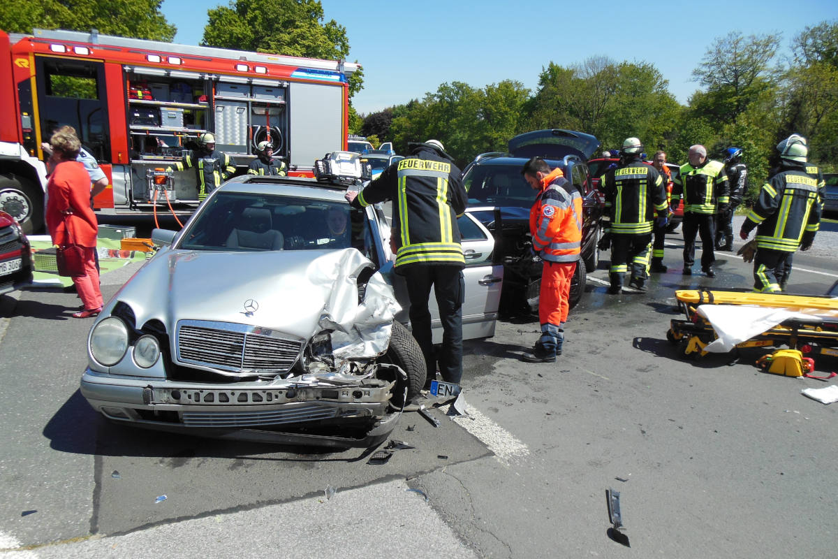 Um 13:48 Uhr wurde neben der Hauptwache der Löschzug 3 alarmiert. Auf der Schwelmer Straße war es zu einem schweren Verkehrsunfall mit zwei Verletzten gekommen. Zwei Autos waren zusammengestoßen. Während die Fahrerin des einen PKW ihr Fahrzeug selbständig verlassen konnte, musste der Fahrer des anderen PKW von der Feuerwehr schonend aus seinem Fahrzeug befreit werden.