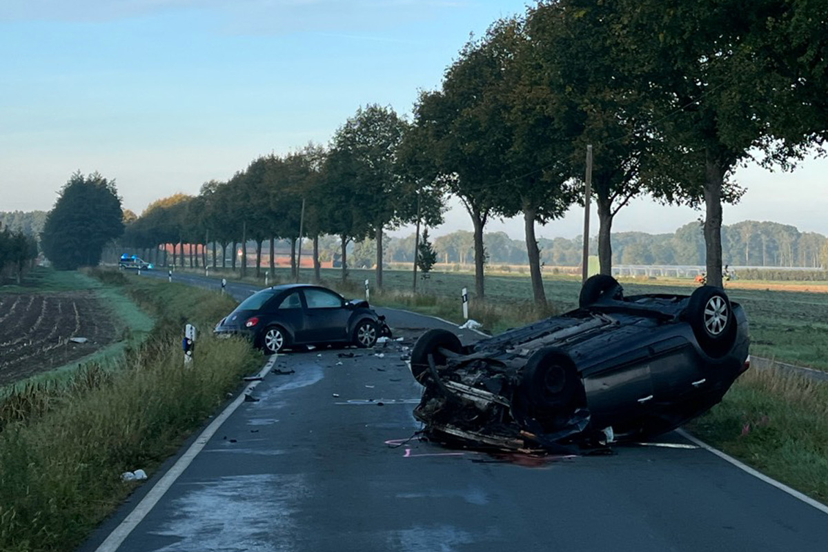 Von dort schleuderte das Fahrzeug zurück auf die Fahrbahn und kollidierte dort mit dem entgegenkommenden VW einer 23-jährigen Frau aus Lüdinghausen, ehe es auf dem Dach liegen blieb.