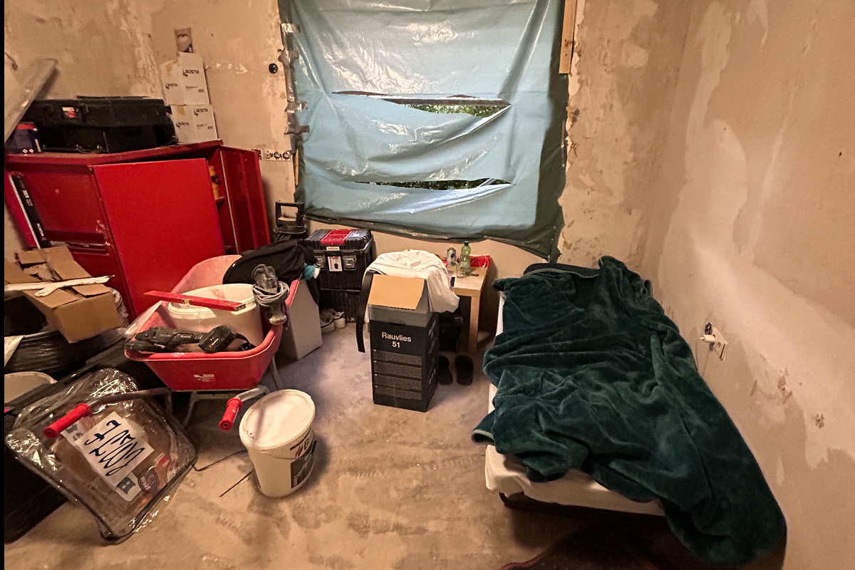 Die Schlafgelegenheiten der Männer befanden sich auf der Baustelle zwischen Werkzeug und Bauschutt.